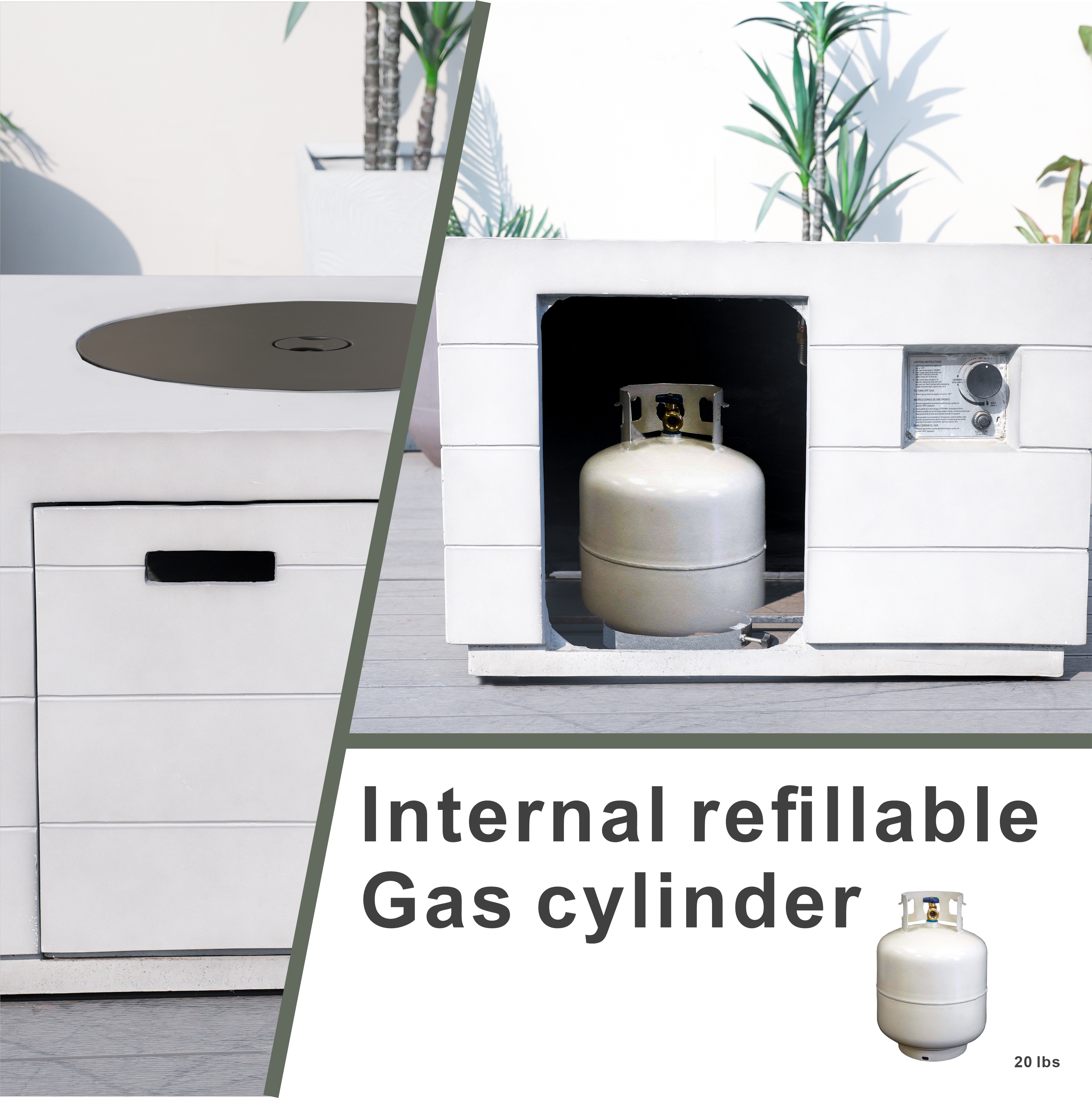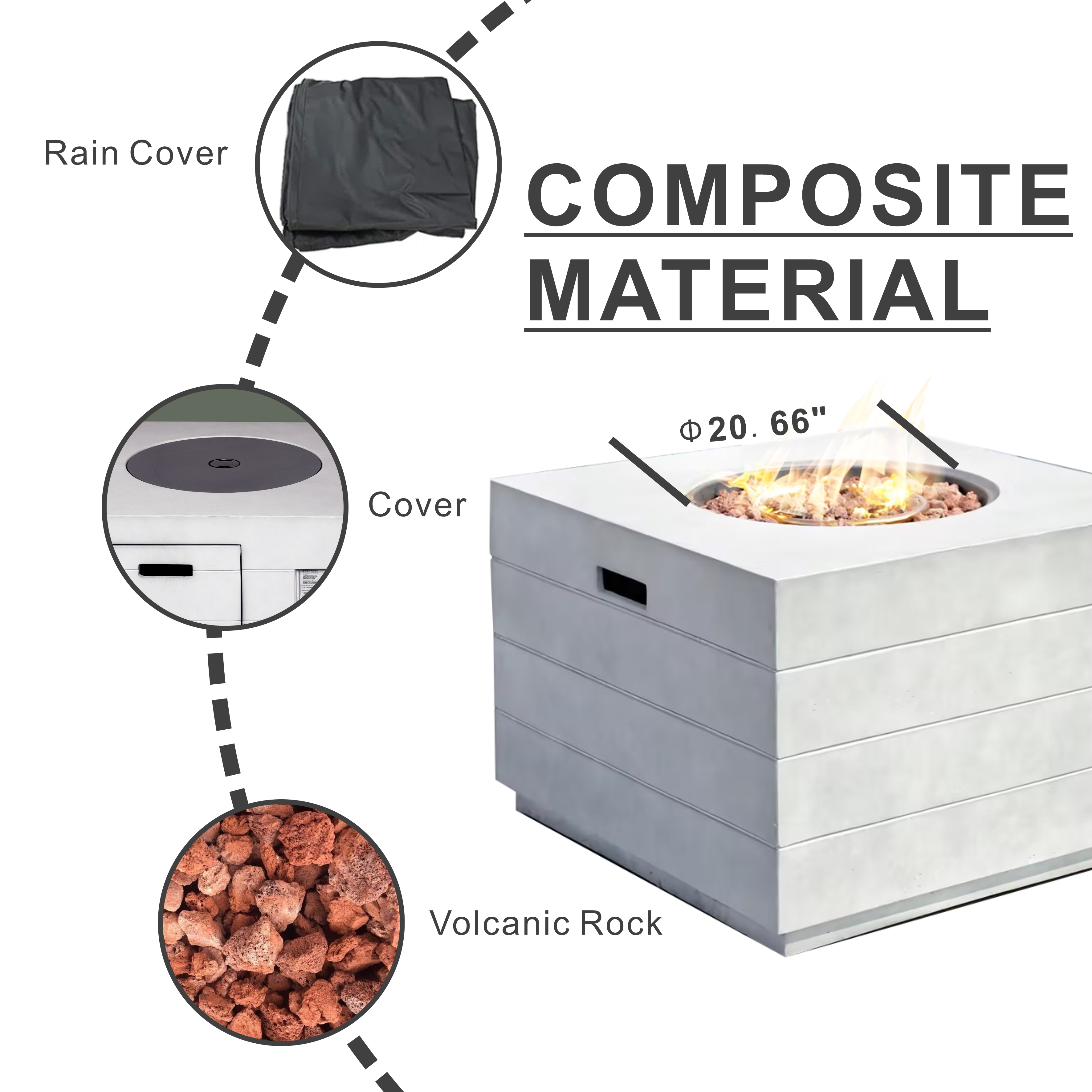 Designed with a large burner system, a spacious fire bowl, and hidden gas tank storage, it keeps your patio looking tidy while delivering strong, steady heat. Every unit comes fully equipped with a fire pit lid, volcanic stones, and a rain cover, so you’re set for year-round outdoor enjoyment.