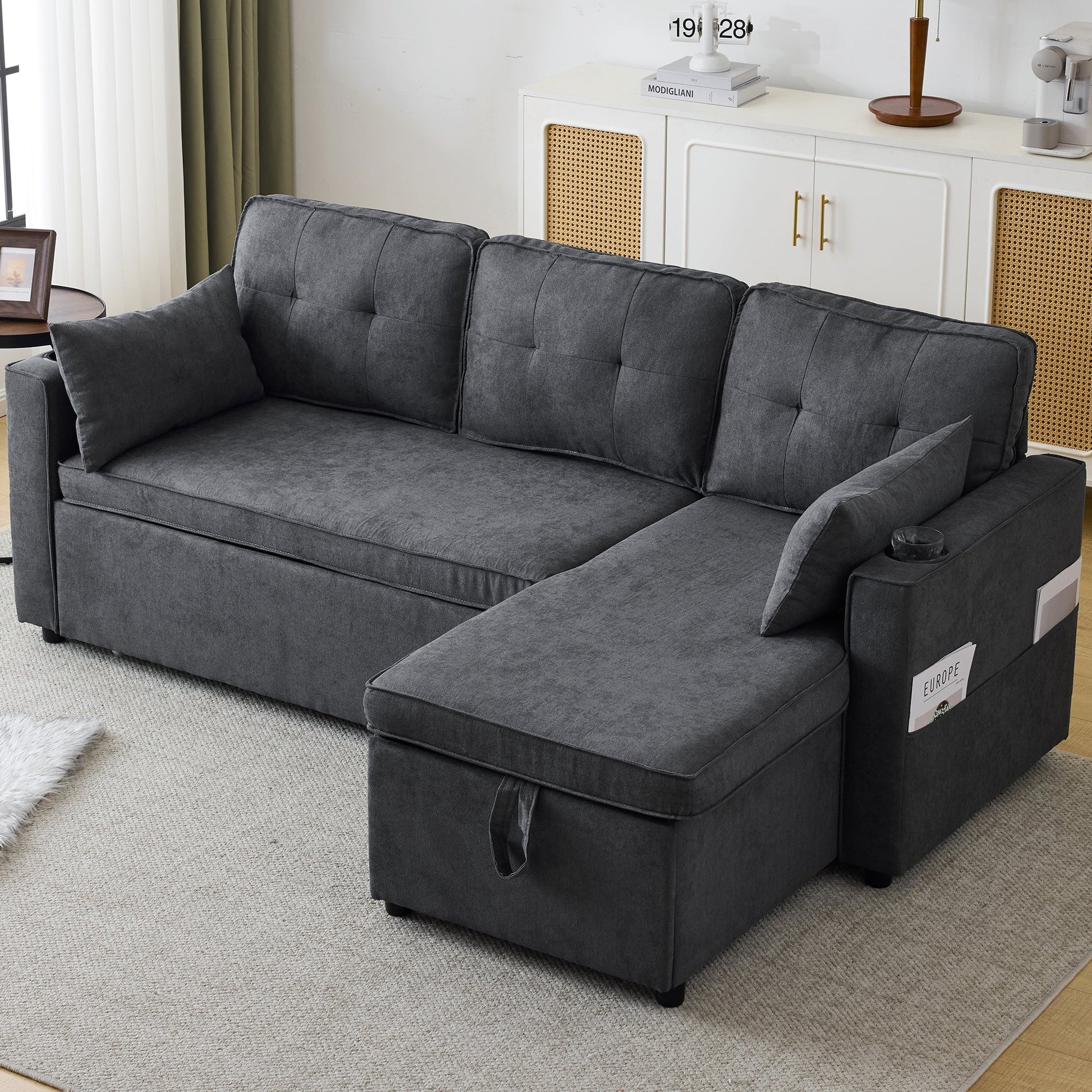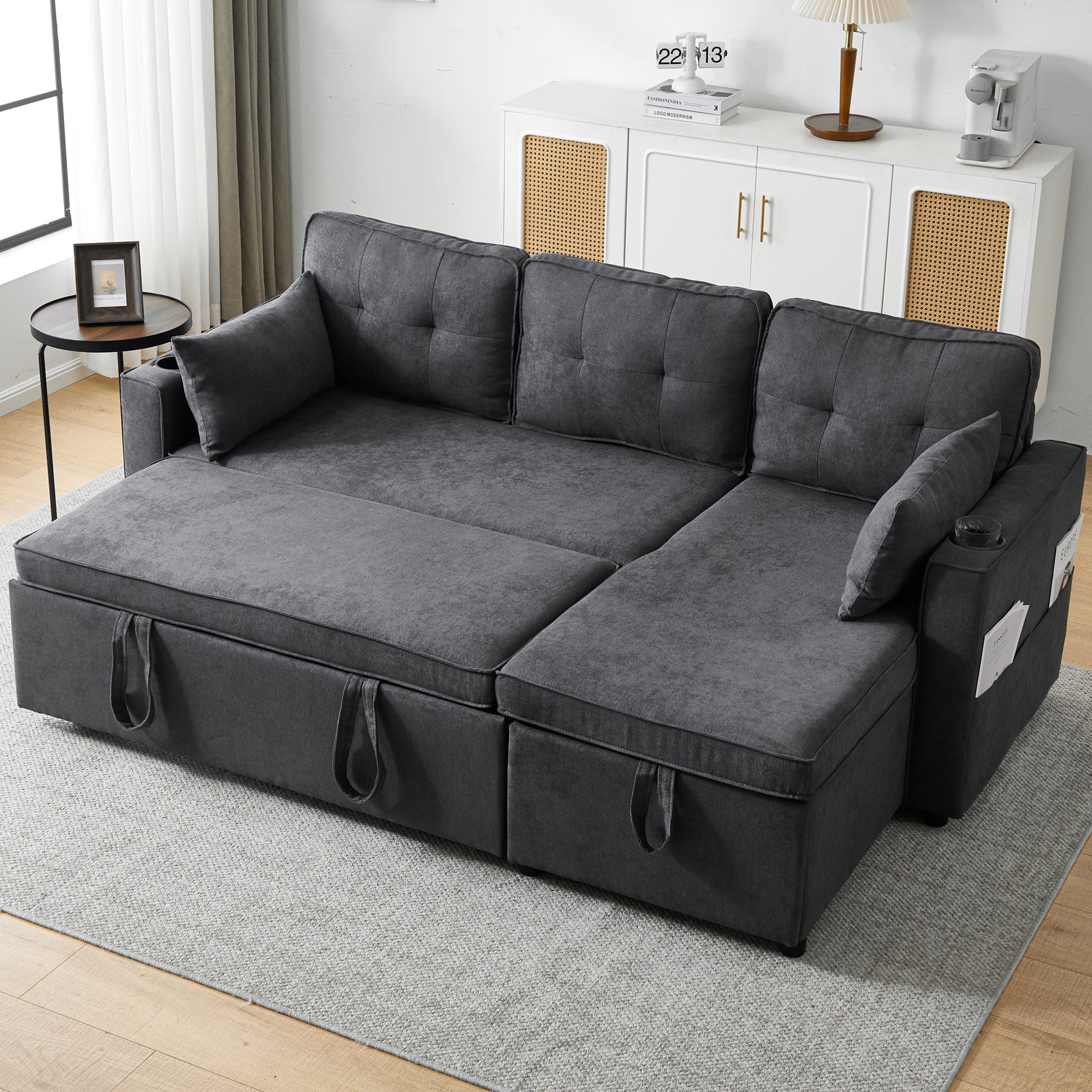 3-in-1 Convertible Sofa Bed with Storage Chaise, Cup Holders, Pillows - Grey