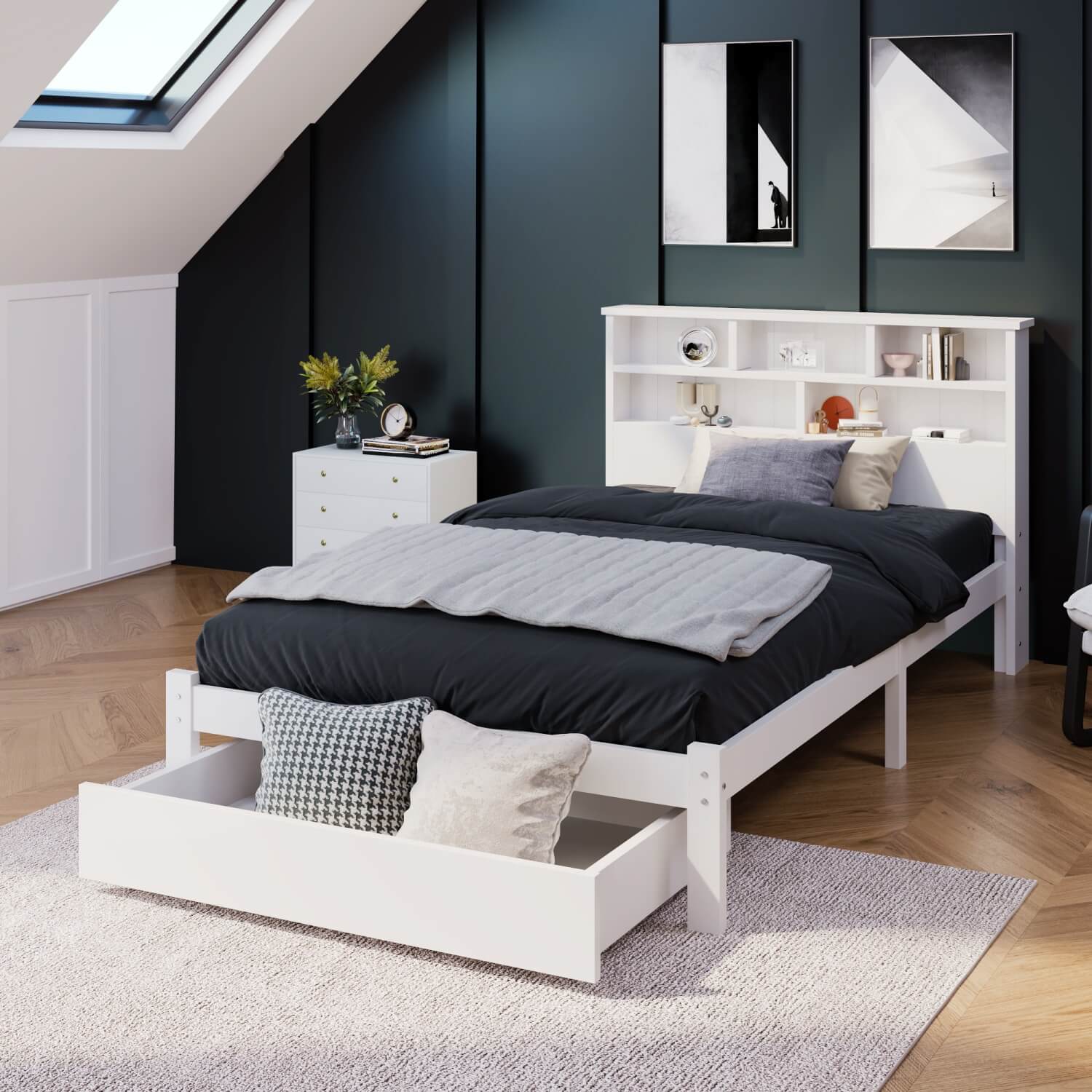 3FT Single Storage Bed with Shelves – White Wooden Bed Frame with Drawer
