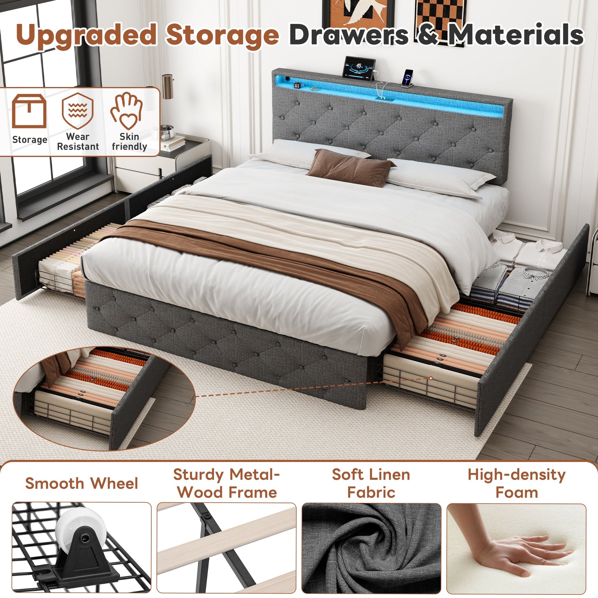 4ft6 Double Upholstered Bed with 4 Storage Drawers, LED Charging Station, Linen Grey