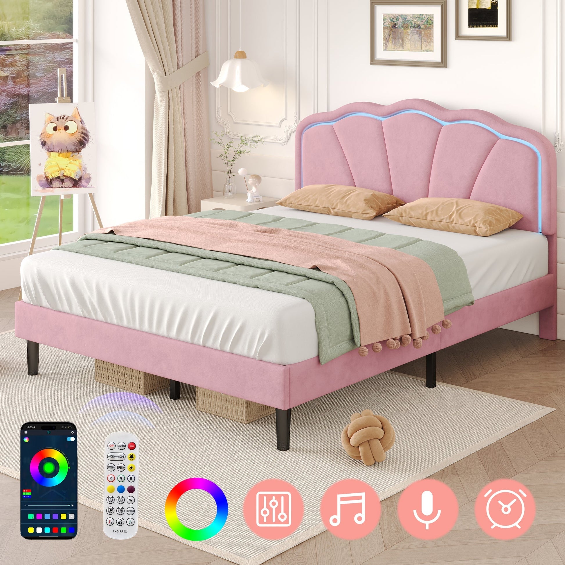 4ft6 Double Upholstered Bed with LED Adjustable Shell Headboard, Soft Velvet, Pink
