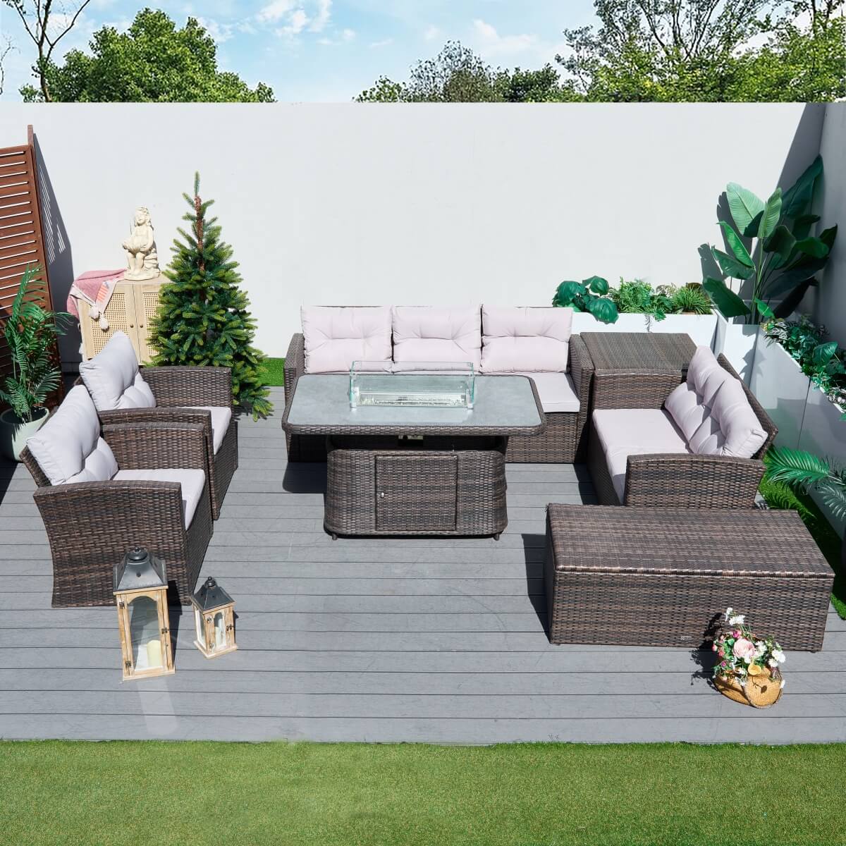 7 Seater Outdoor Rattan Fire Pit Sofa Set – Garden Lounge with Height Adjustable Fire Pit Table and 2 Storage Boxes