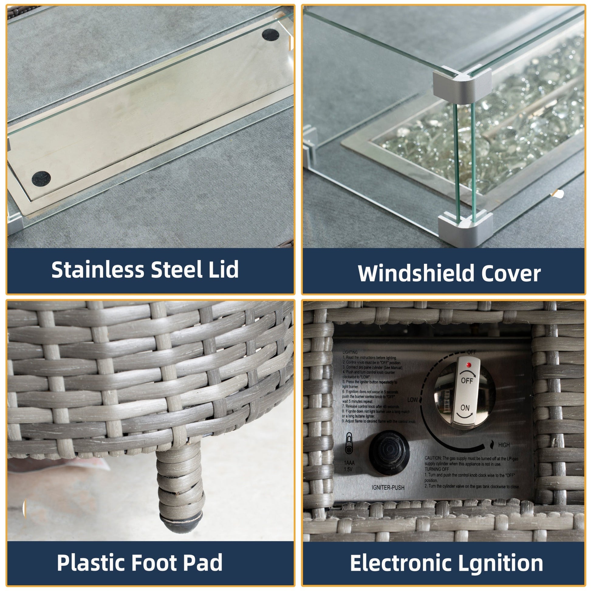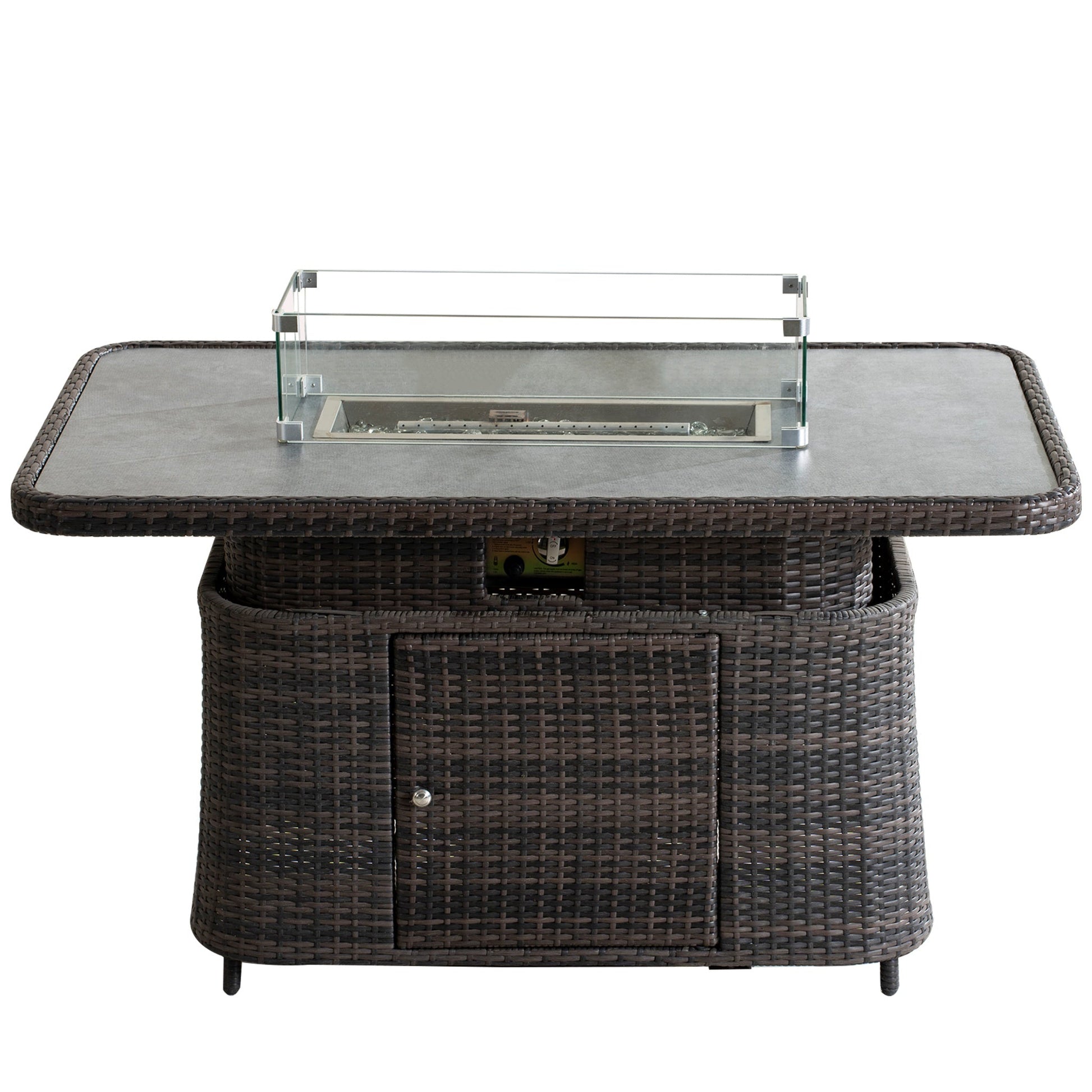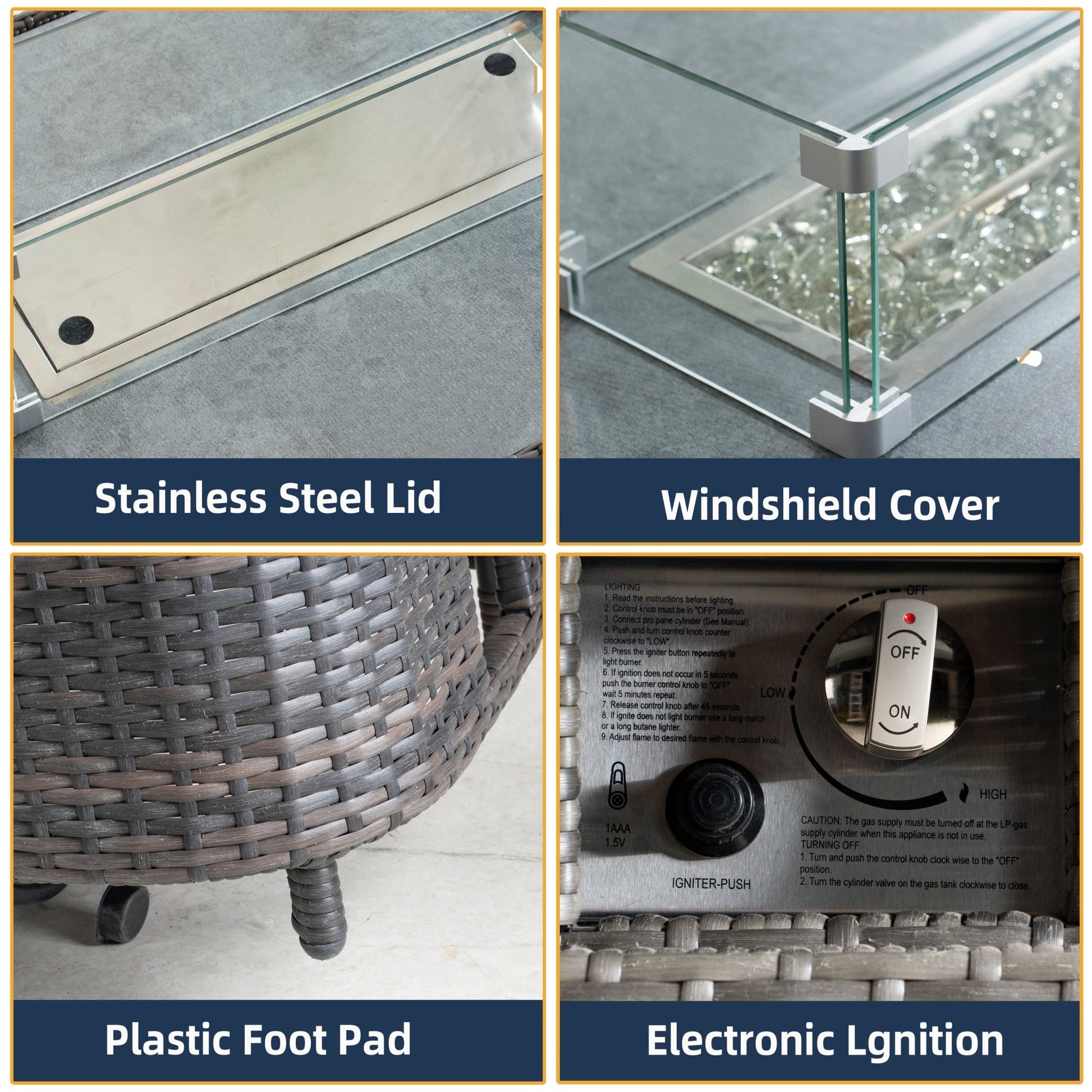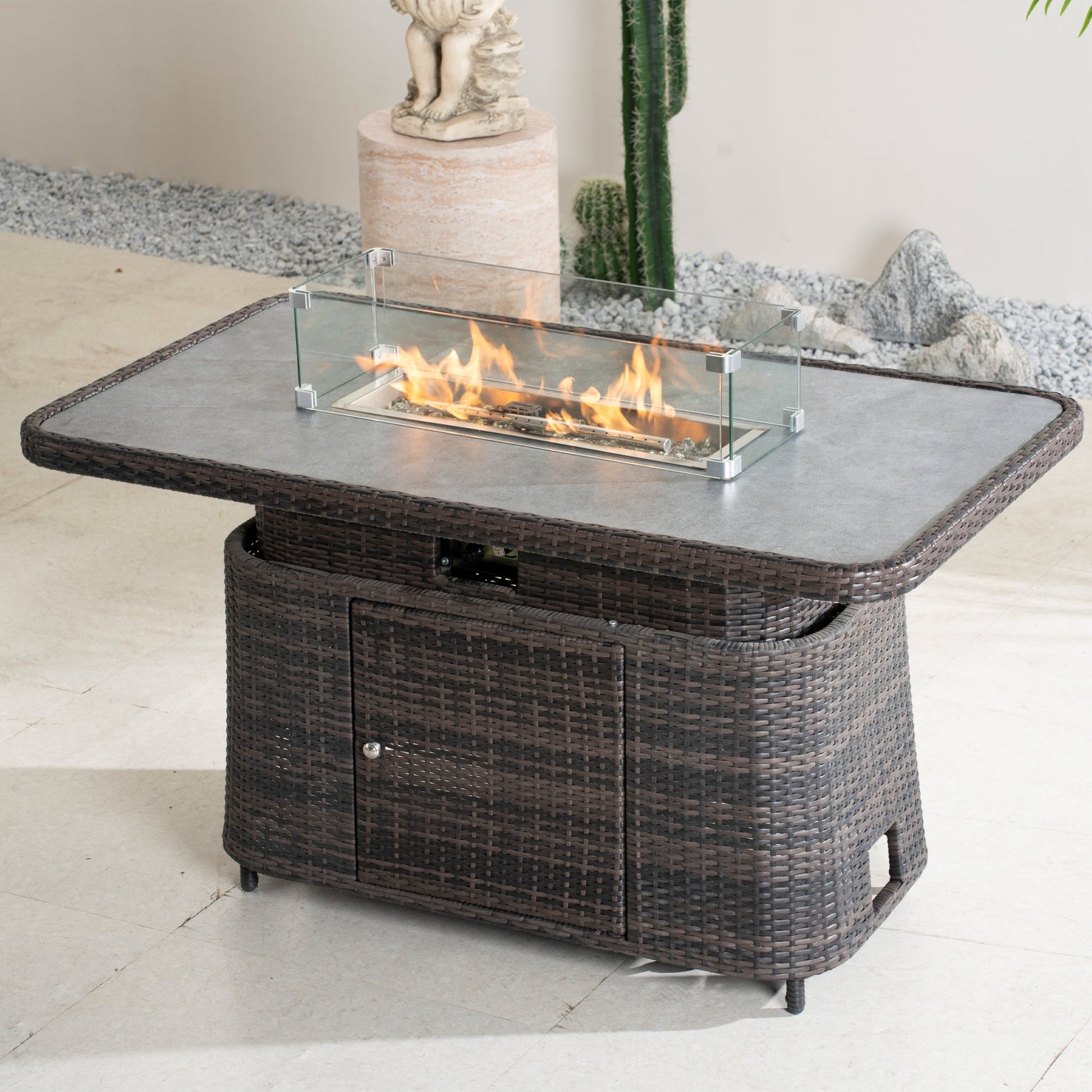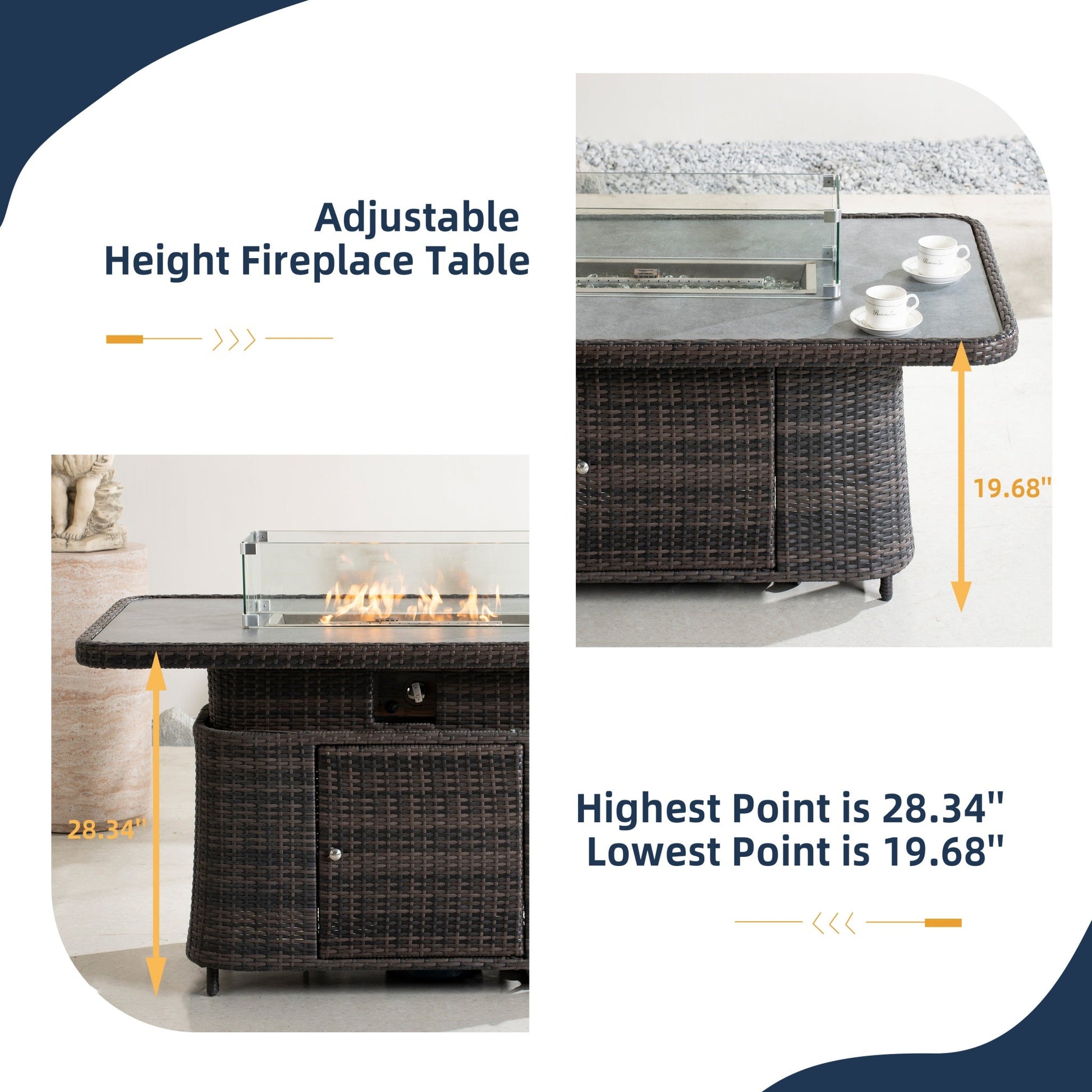 This aluminum adjustable fire pit table combines functionality and elegance, serving as a coffee table when lowered and a dining/fire pit table when raised. The table is crafted with durable brown-grey wicker weaving over an aluminum frame, featuring a tempered glass tabletop with stone-like print finish for a modern and sophisticated look. Its 50,000 BTU stainless steel fire system delivers warmth and ambiance, while the included glass wind guard and fire glass beads enhance both safety and style. Perfect for versatile outdoor use, this table makes a stunning centerpiece for patios, gardens, and backyard gatherings.