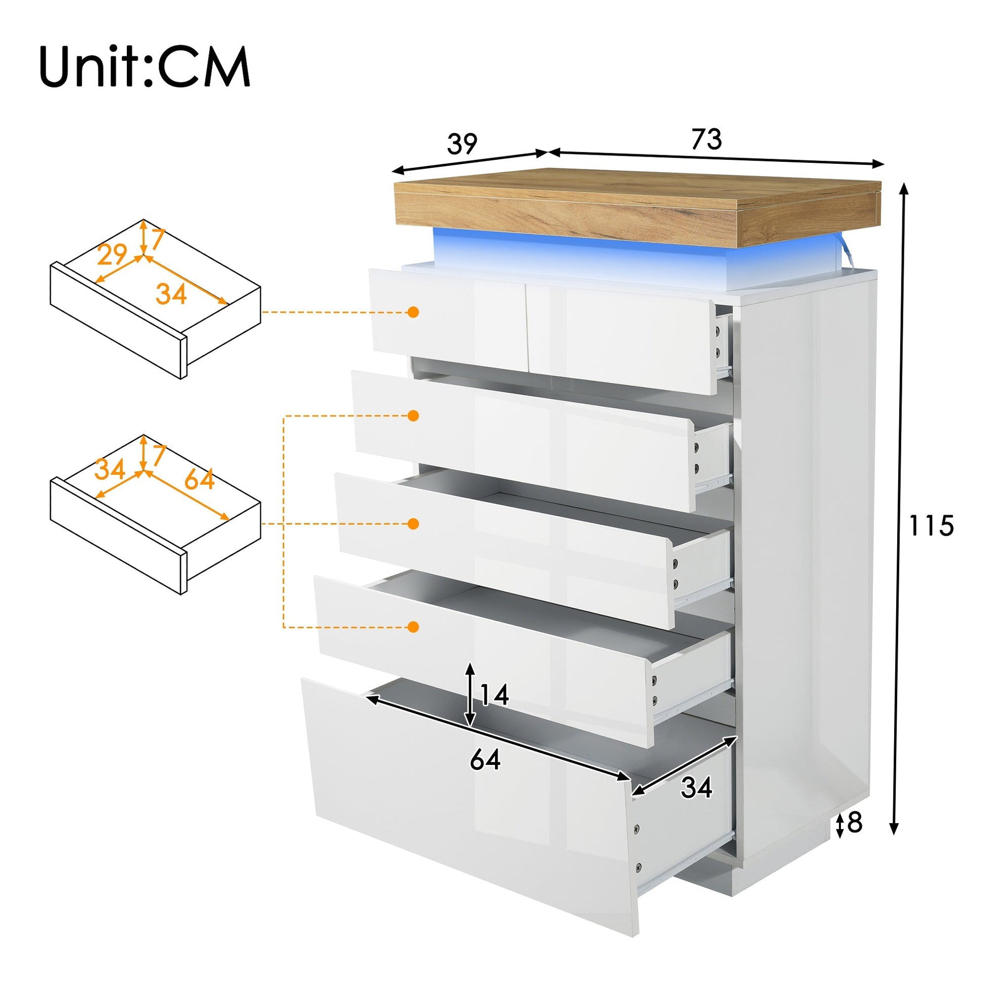 Add a touch of modern elegance to your home with this high-gloss chest of drawers. Its sleek sculptural design, glossy finish, and handleless front create a clean, minimalist look that blends seamlessly with contemporary interiors. The easy-to-clean surface combines style with practicality, while the integrated LED strip offers hundreds of colour options, dynamic modes and a music function, all controllable by touch switch or smartphone app, giving you the freedom to set the perfect mood.