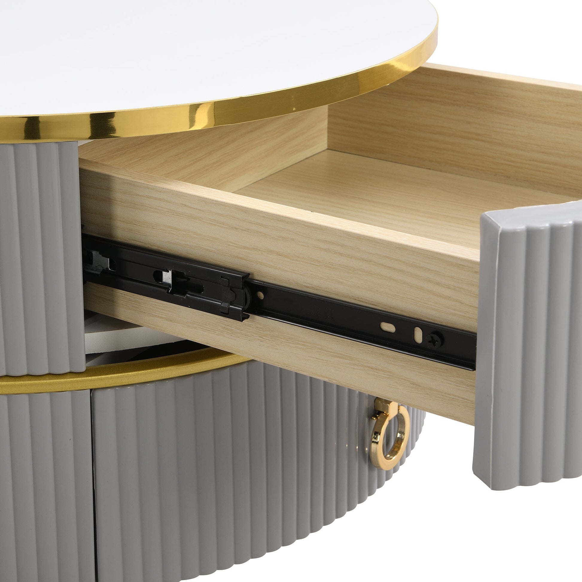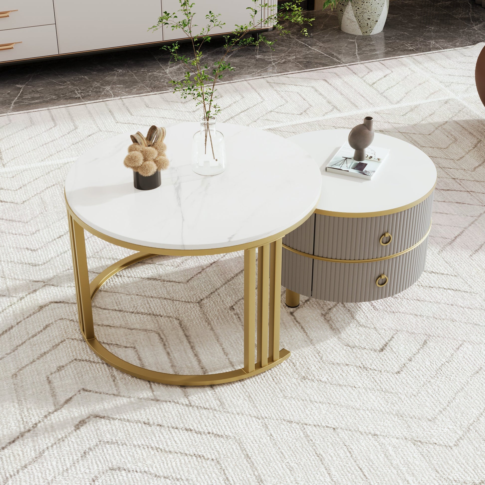 Coffee Table Set, 2-in-1 MDF Round Coffee Table with 2 Drawers & Side Table, White and Grey