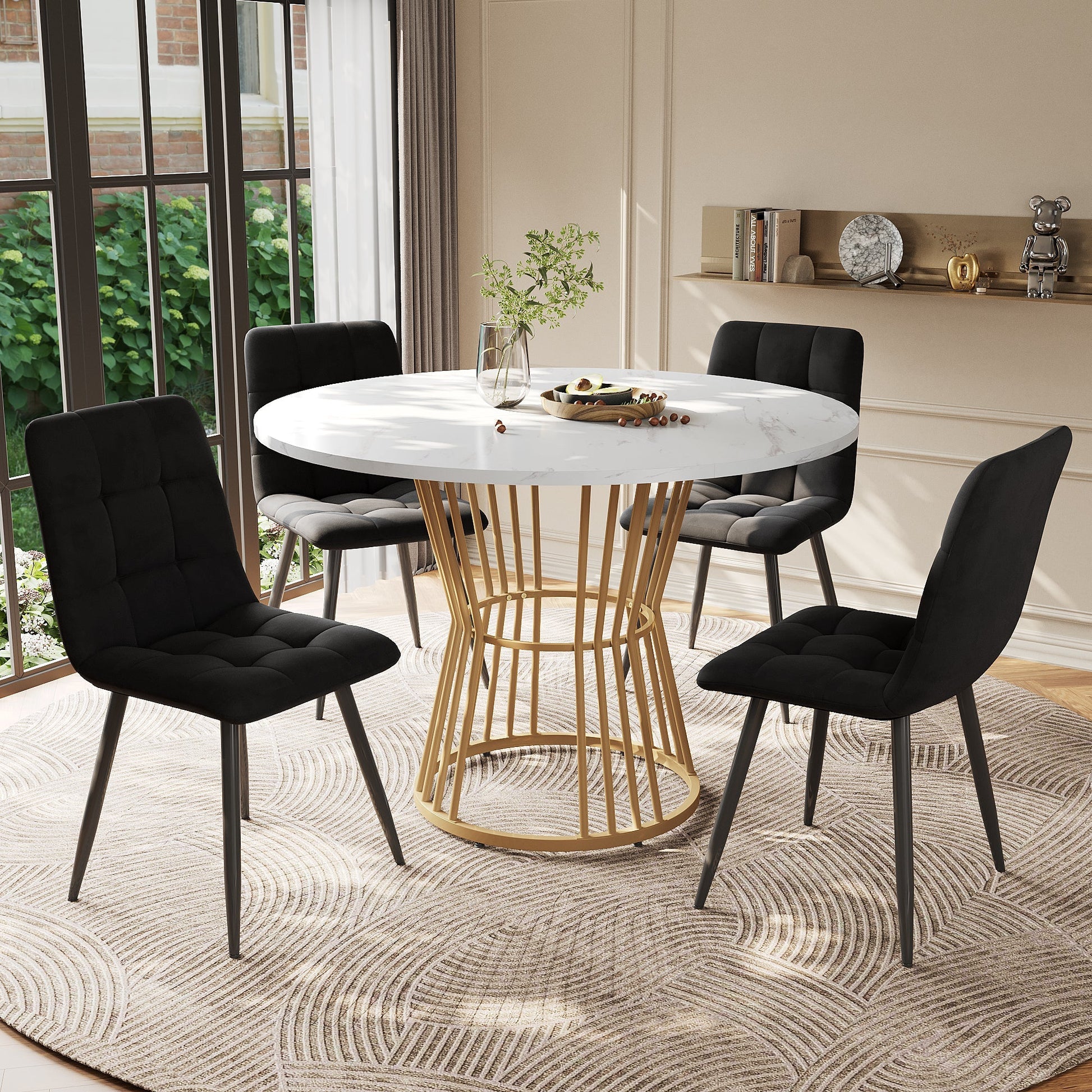 Dining Table Set, Round with Golden Metal Legs, White MDF Top, Black Velvet Chairs