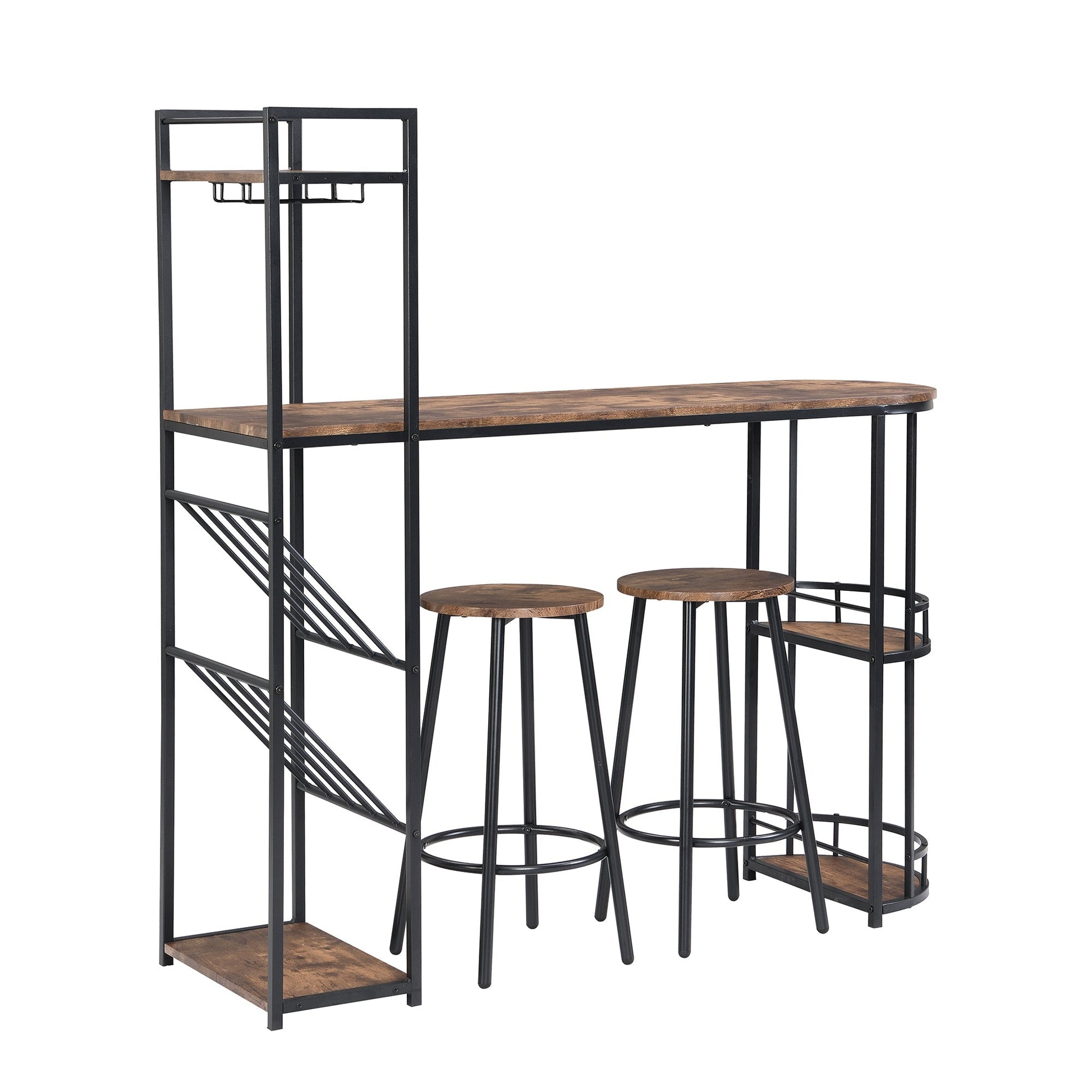 Industrial Bar Table Set: 2 Chairs, Counter Height, Wine Rack, Side Storage (Rustic Brown)