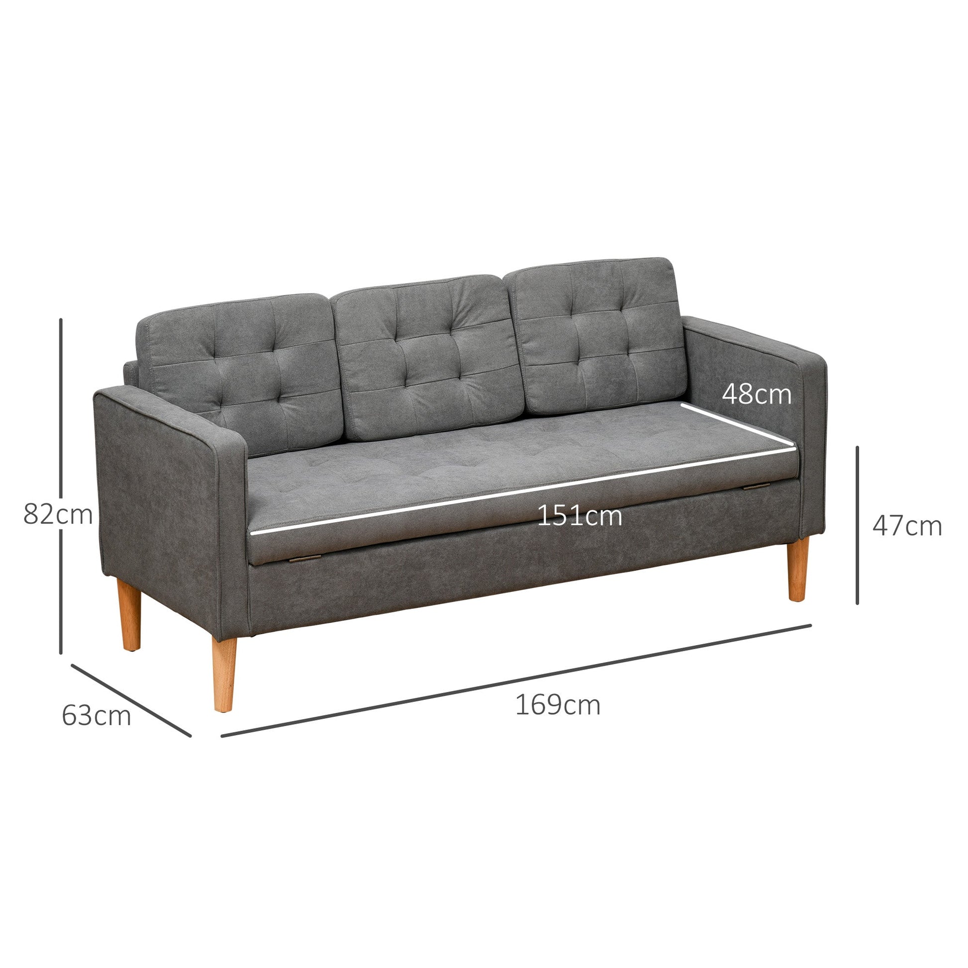 Modern 3 Seater Sofa, Hidden Storage Couch with Wood Legs, Grey Cotton