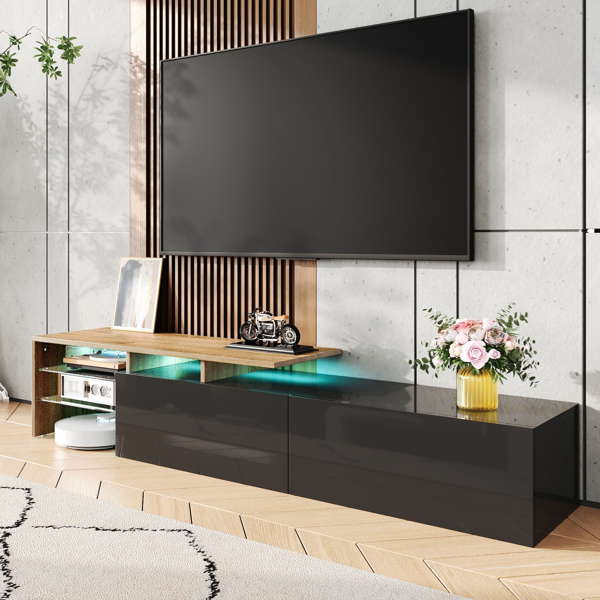Modern TV Cabinet: Stylish, Elegant, Storage with Glass Shelves, LED Lighting, Black and Wood