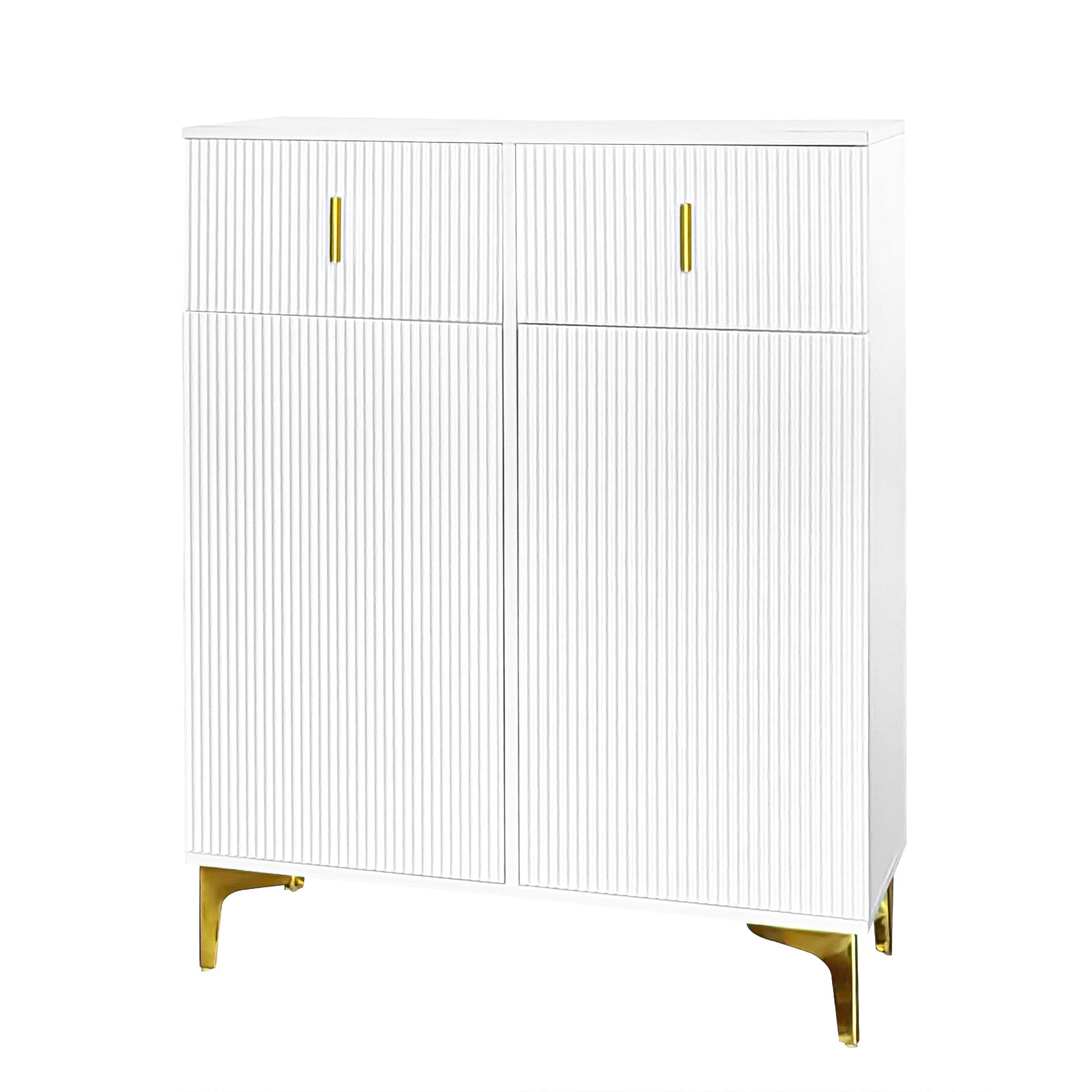 This elegant sideboard combines style and practicality with two drawers, two doors, and textured paneling for a refined look. Inside, adjustable shelves provide versatile storage, while soft-close hinges and a push-open design ensure smooth functionality and a sleek, handle-free finish. Accented with gold-plated handles and legs, it adds a touch of luxury to any room, whether used as a sideboard, shoe cabinet, or dressing table.