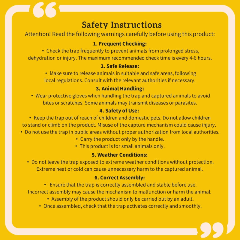Doesn't harm animals: Suitable for capturing pests, it keeps them alive inside the cage. Its long design provides enough space for them to move ¨C suitable for capturing multiple animals at the same time.