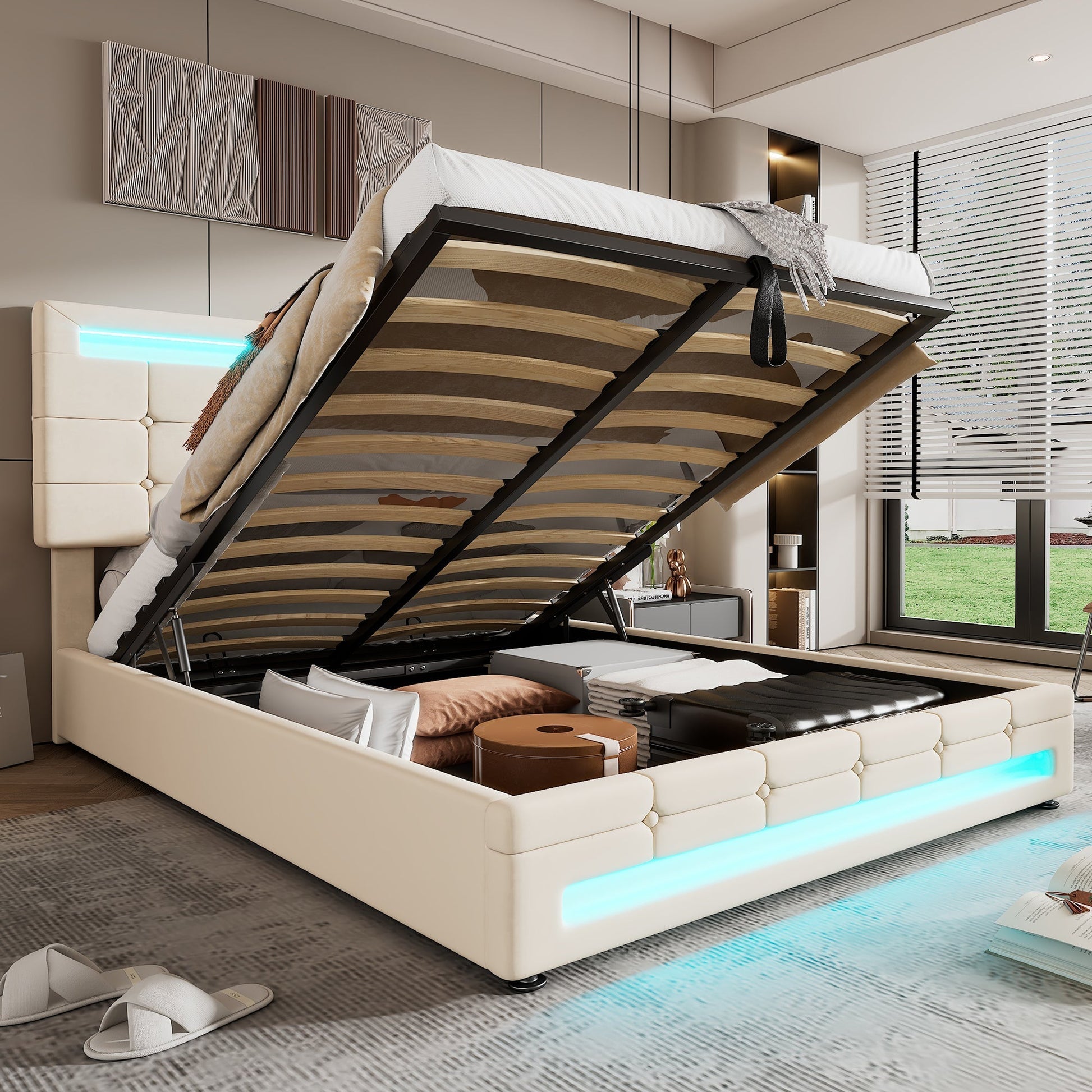Upholstered Bed, Hydraulic 4ft6 Double 135x190cm with Square Embellishment & 7-Color LED, Velvet & Iron Beige
