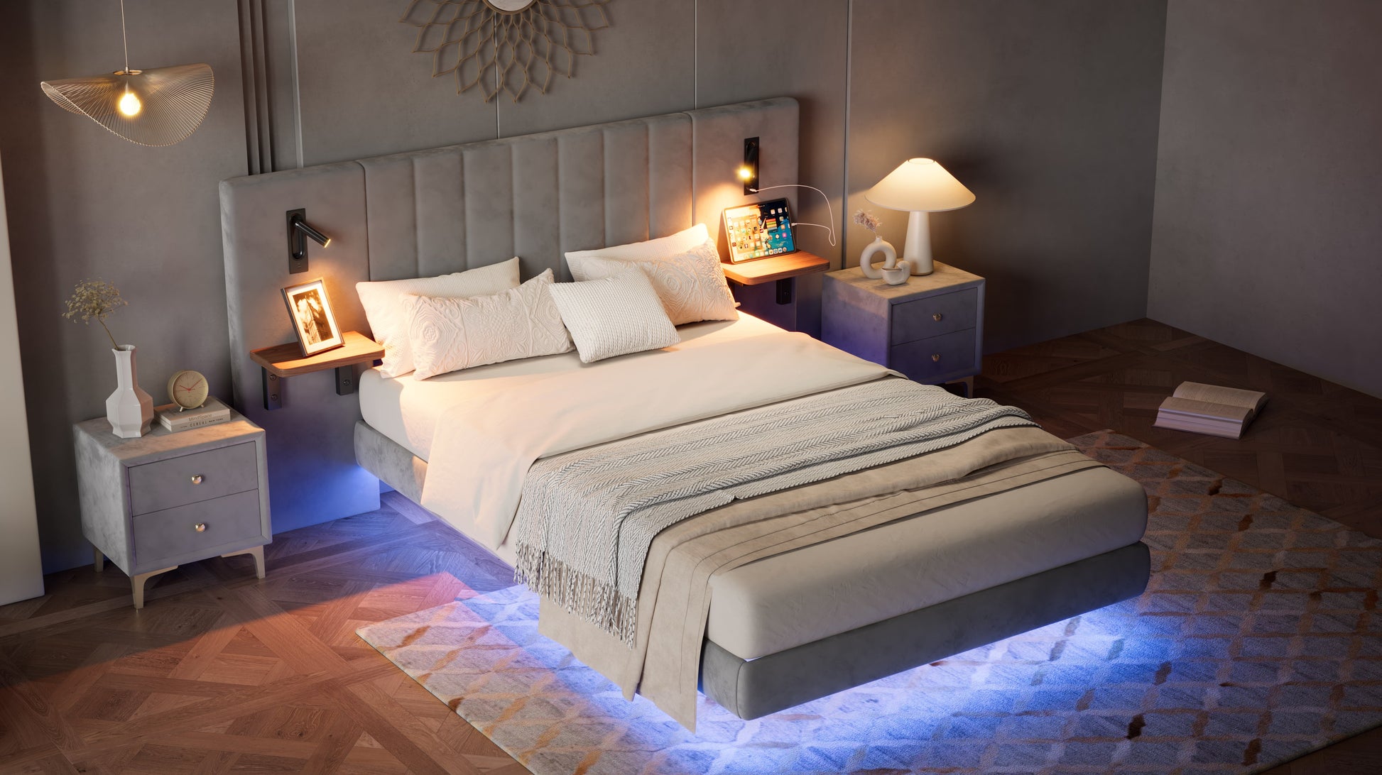 The upholstered double bed for adults and teenagers. The headboard is equipped with a single-color reading light for easy nighttime illumination, enhancing the bedroom ambiance. Traditional control methods such as IR, 433MHz, 2.4GHz and other old-fashioned wired methods will be replaced by mobile phone control with convenient, powerful and expandable functions. Through this APP, you can not only control the colour, brightness and colour temperature of the LED strip, but also set various music rhythm modes! Featuring a grey velvet fabric and a sturdy iron base frame, this versatile bed combines modern style with practicality to provide luxurious and durable comfort in the bedroom. The shape is simple but not simplistic, highlighting the design concept of "less is more".