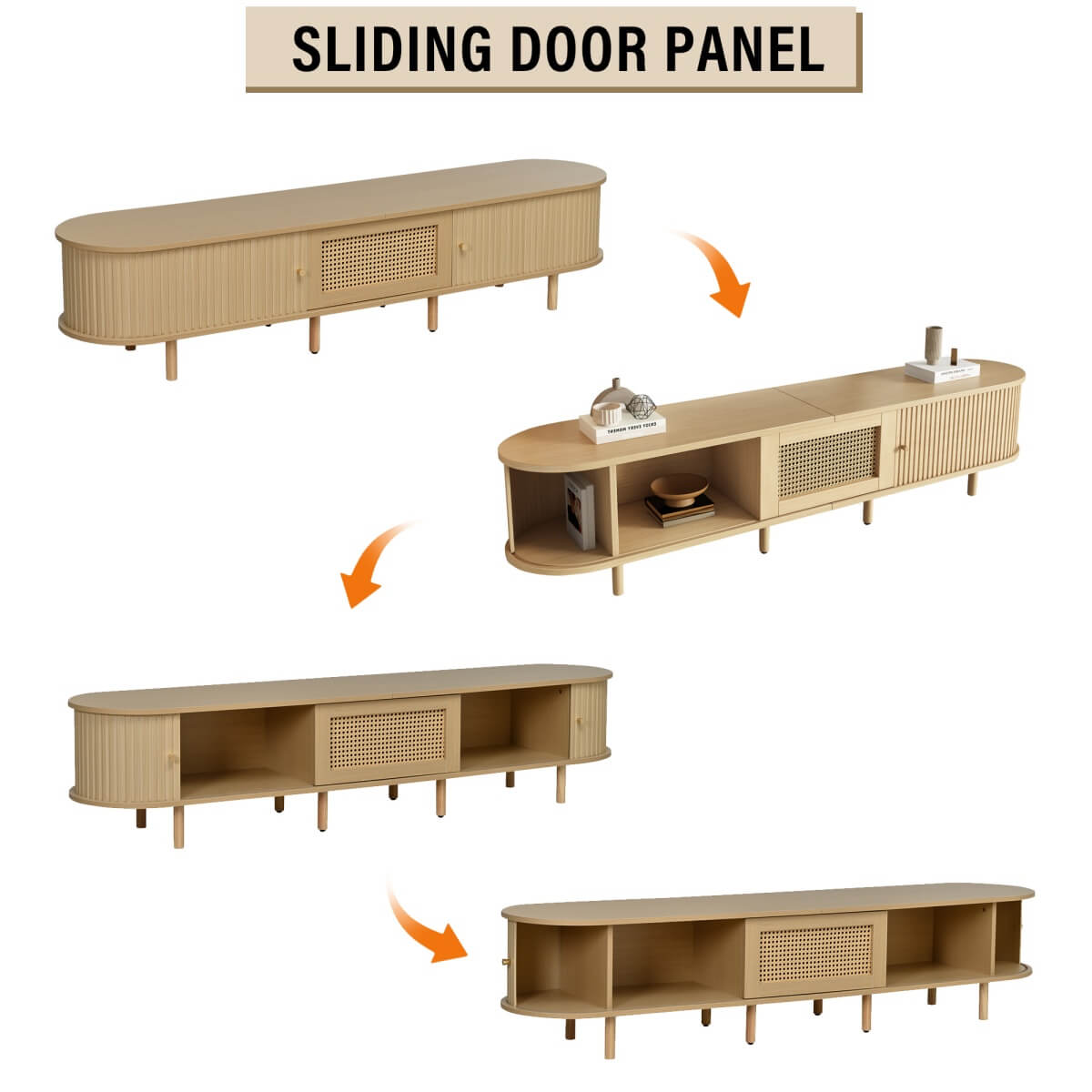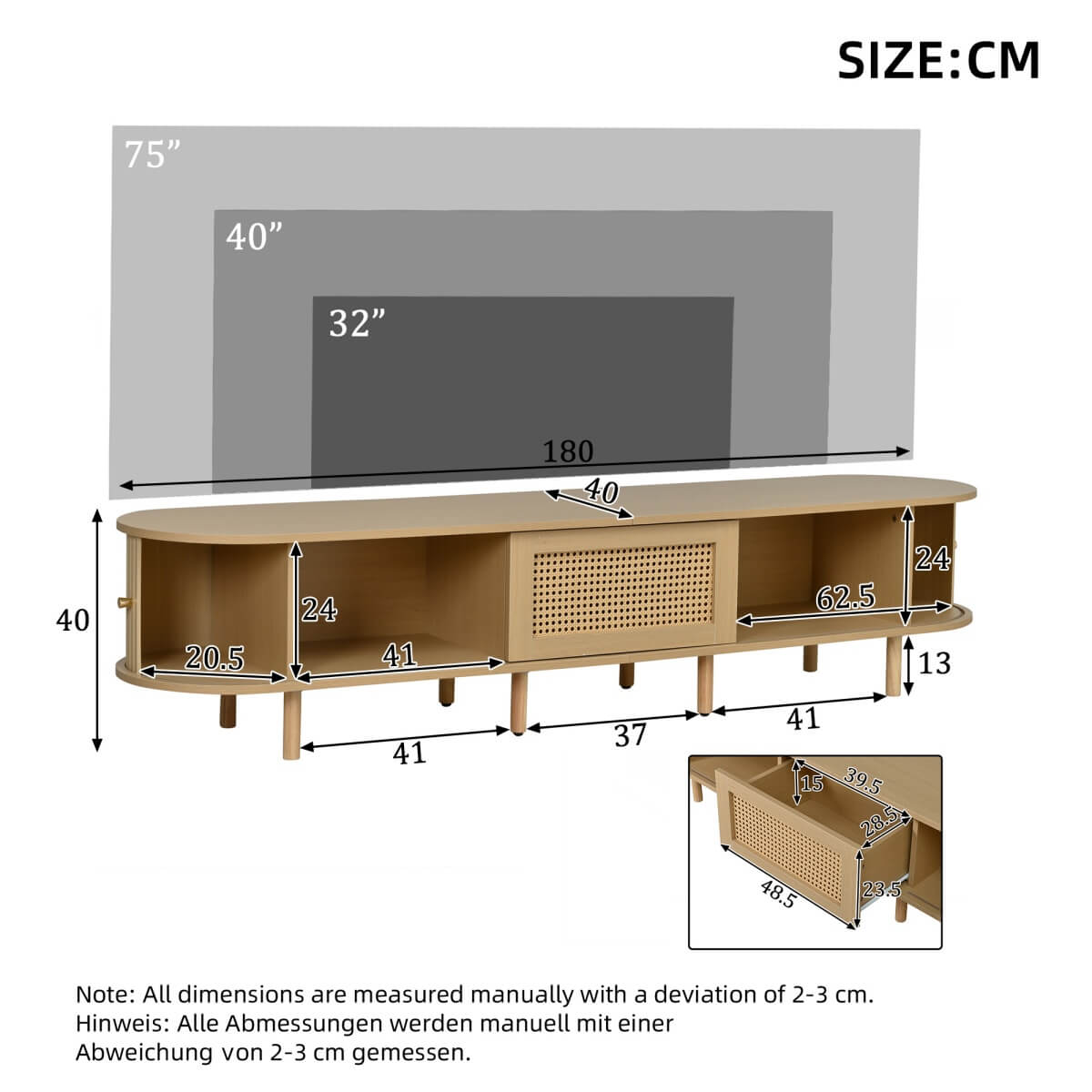 Elevate your living room with this stylish and practical TV stand, combining natural aesthetics with modern functionality. Crafted from environmentally friendly MDF, the cabinet features a rattan drawer at the centre and two embossed sliding doors, providing versatile storage for remotes, books, and decorative items. The oval tabletop with rounded corners is ideal for TVs up to 70 inches and prevents accidental bumps. Eight sturdy solid wood legs, four with adjustable height knobs, ensure stability even on uneven floors. The matte, anti-fingerprint surface is easy to maintain, offering a refined finish that complements Nordic, modern, or light-luxury interiors.