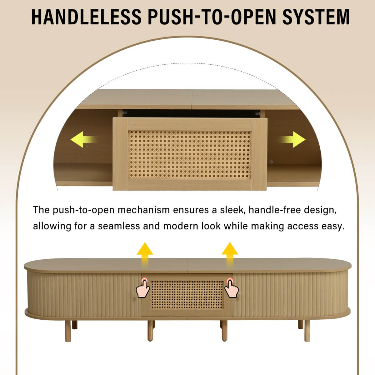 Oval TV Stand with 1 Rattan Drawer & 2 Sliding Doors – Light Wood TV Cabinet Sideboard for Living Room