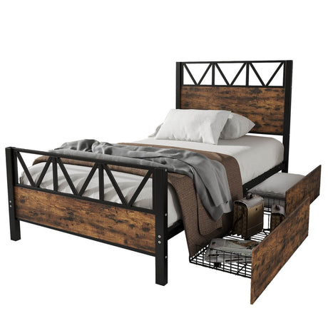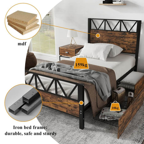 3ft Single Metal Storage Bed Frame with Drawers - Iron Bed for Adults & Teenagers
