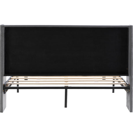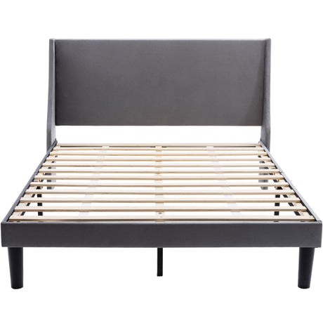 Double Bed Velvet Grey 4FT6 Upholstered Bed with Winged Headboard, Wood Slat Support