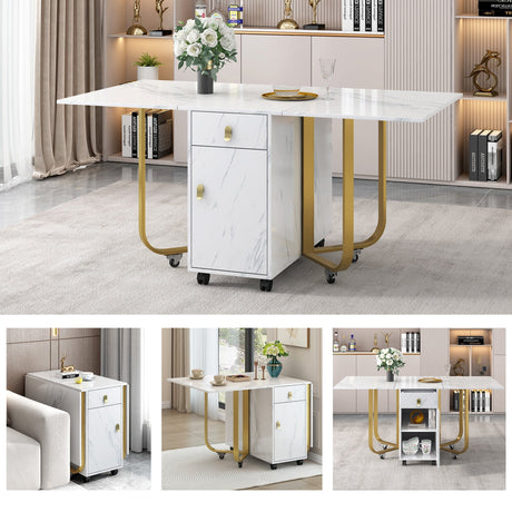 Folding Dining Table with Cupboard & 2 Drawers, Space-Saving Kitchen Utility Table, White/Gold