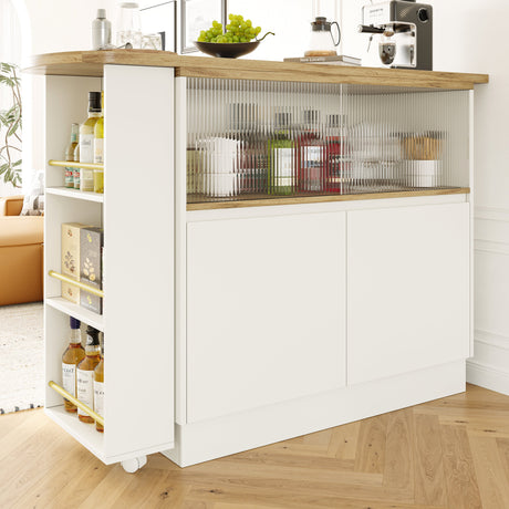 Bar Table, 360?? Rotating Dining & Storage Cabinet with Glass Door, White