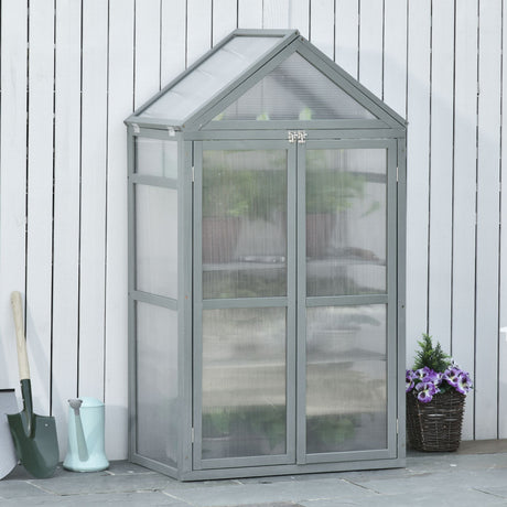 Garden Cold Frame Polycarbonate Greenhouse with Adjustable Shelves, Double Doors, Openable Top, Grey
