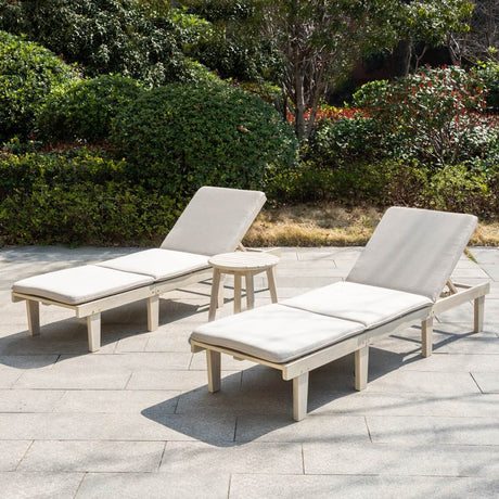 Outdoor Solid Wood Sun Lounger Set - 2 Adjustable Backrest Loungers with Round Side Table
