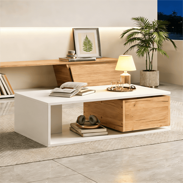 High Gloss Coffee Table with 360° Rotating Drawer – White & Wood Centre Table
