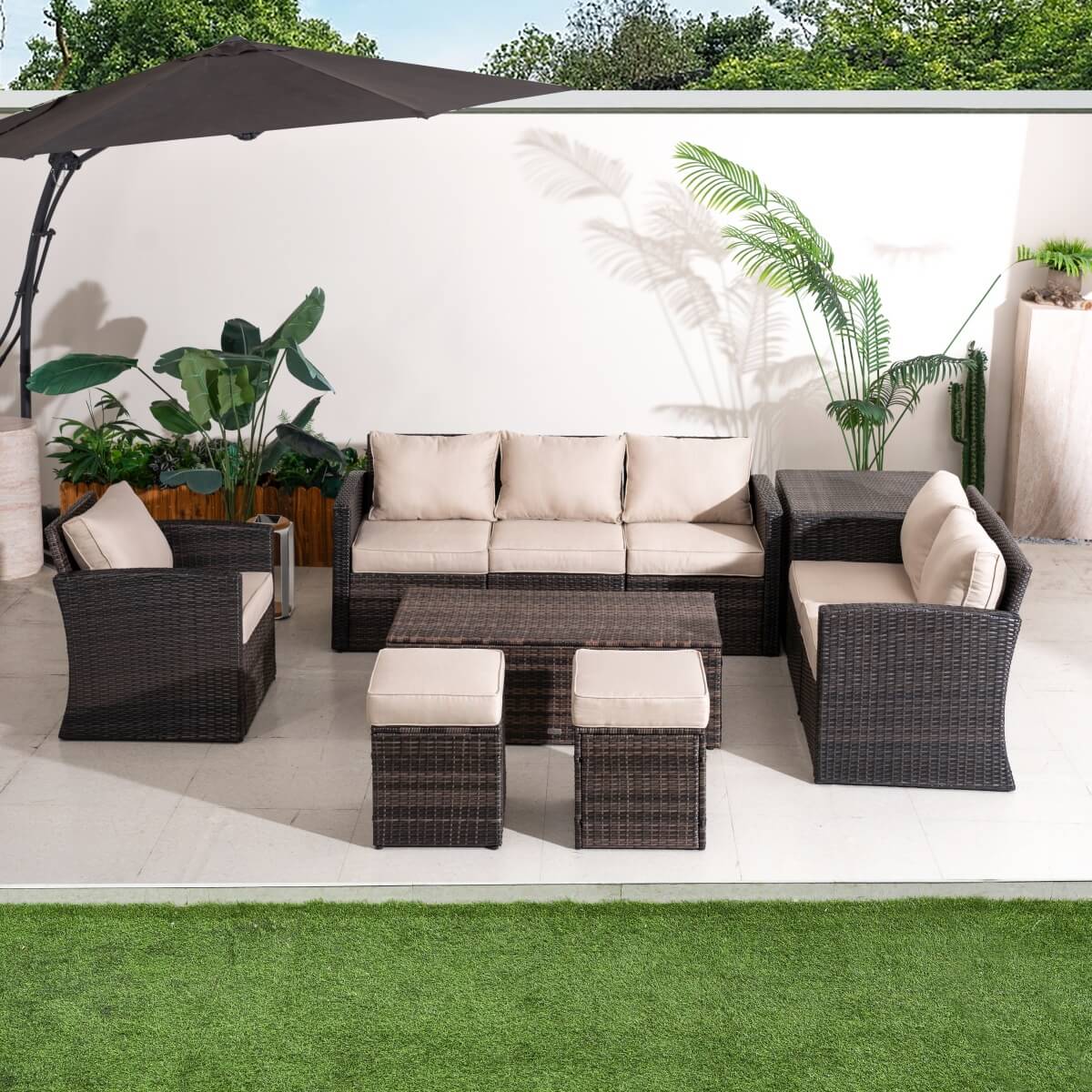 8 Seater Outdoor Garden Lounge Set – Rattan Sofa with Coffee Table and Side Table with Built-In Storage, Footstools and Cushions Included