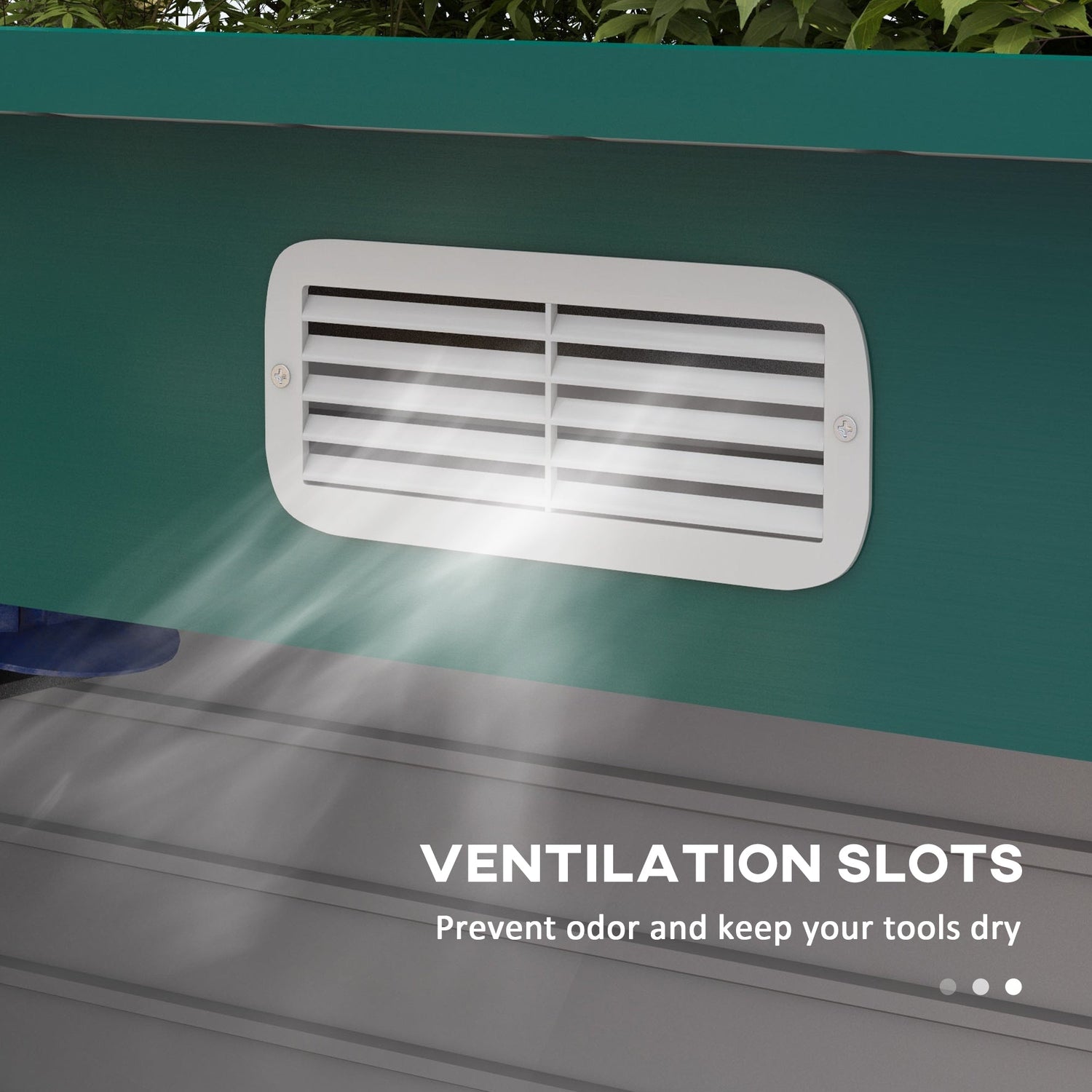 Two ventilation slots: Brings air inside garden tool shed, helps prevent odour and keeps tools and equipment dry.