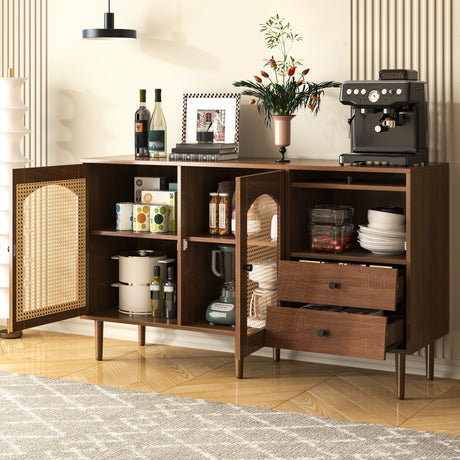 Country-Style Sideboard with Rattan Doors, Magnetic Closure Adjustable Shelves, Wood Tone