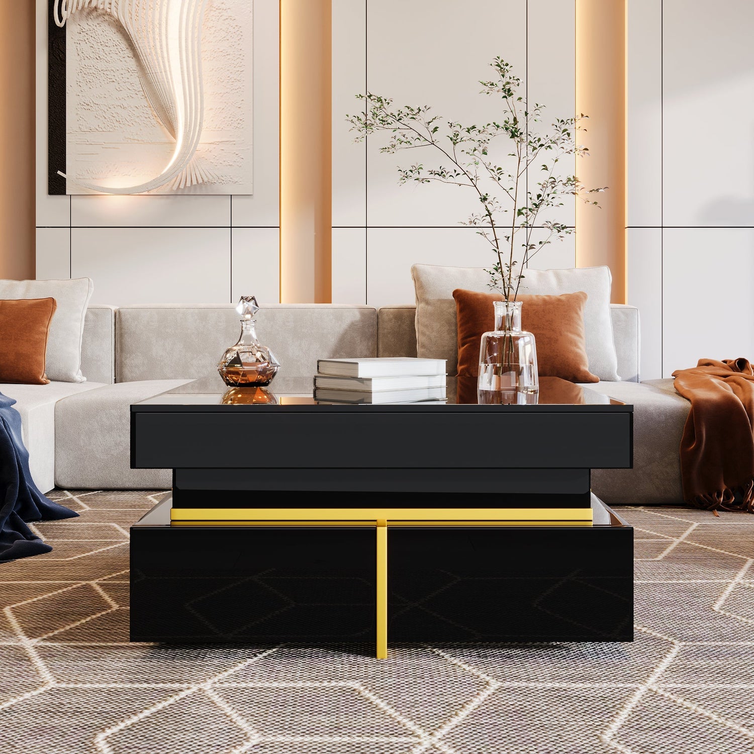 Coffee Table, High-Gloss, with Drawers, Gold Accents