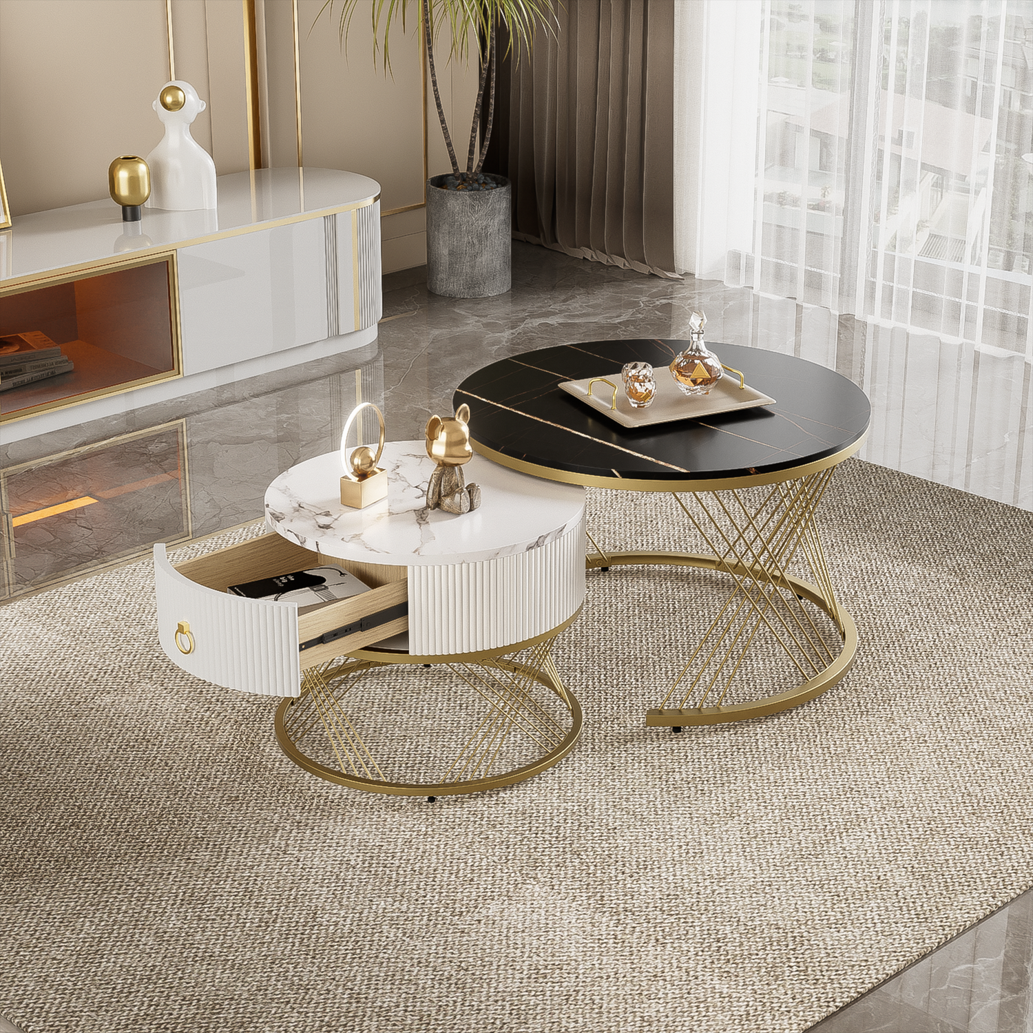 Elegant nesting Coffee Table: Marble Look, Gold Decor, Side Table with Drawers - Set of 2