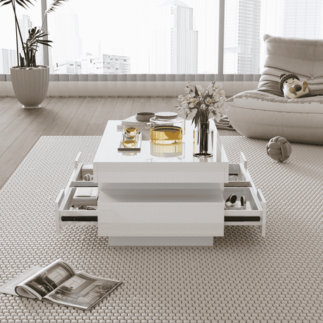 Coffee Table, High-Gloss, LED Light, Four Drawers, Large Storage