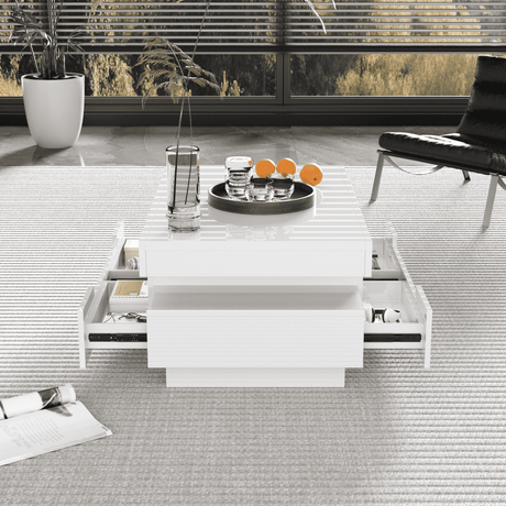 Coffee Table, High-Gloss, LED Light, Four Drawers, Large Storage, White