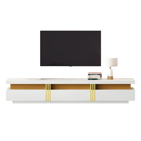 Luxury TV Stand with Faux Marble Top, 3 Drawers for TVs Up to 89'', Golden Panel, White