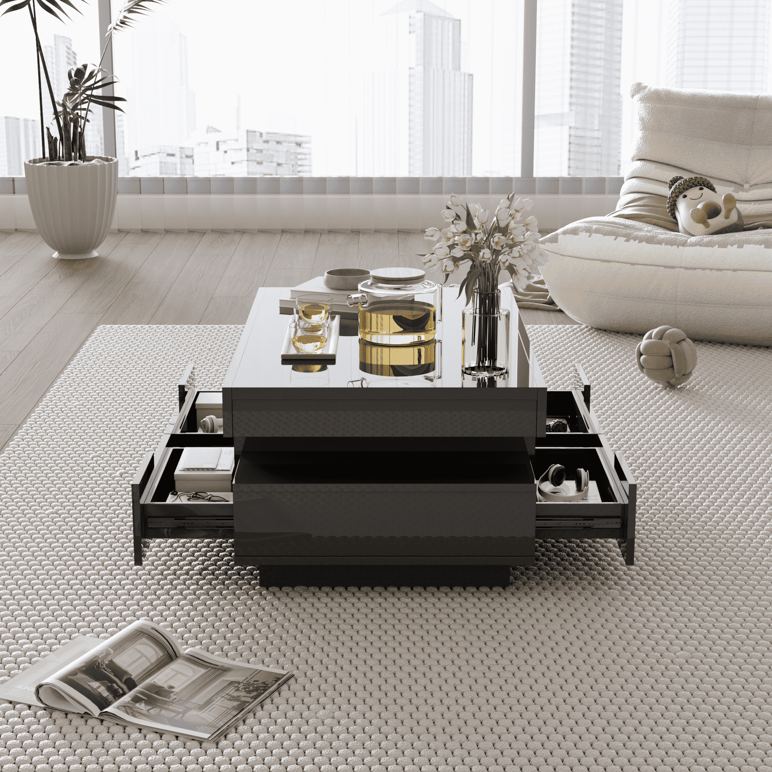 Coffee Table, High-Gloss, LED Light, Four Drawers, Large Storage, White