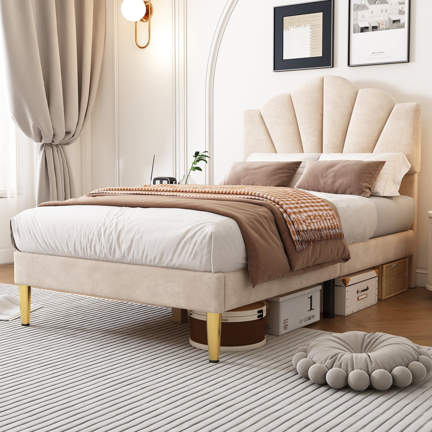 Velvet Upholstered Single Bed, 3ft Shell-Like with Golden Iron Legs and Wooden Slatted Frame, Beige